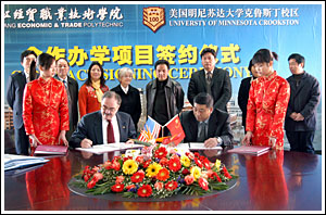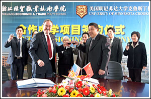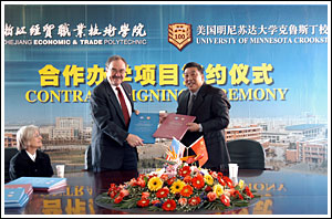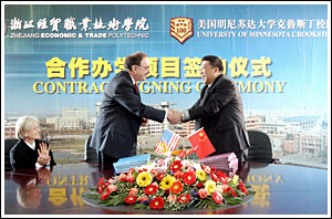 12月23日上午,学院与美国明尼苏达大学克鲁斯顿分校合作办学协议在我院签订。学院院长李曙明和明尼苏达大学克鲁斯顿分校首席副校长Joe Massey博士分别代表双方学校签字。浙江省供销社副主任周加洪、学院党委书记童学敏等领导出席签约仪式。今后,我院将与美国明尼苏达大学克鲁斯顿分校在科研学术交流,师资交流,学生、教师互访等方面开展广泛交流与合作。