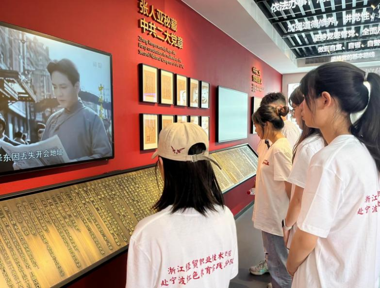 “同学们,你们知道第一部《中国共产党党章》是怎样保存下来的吗?”实践小分队的大学生们第一站来到了位于宁波北仑的张人亚党章学堂。一张张照片、一件件实物拉近了学生们与历史的距离,在这里大家全面了解张人亚同志的革命历程、张人亚家族共同守护珍贵文献的感人事迹,深切感受到了共产党员质朴的初心本色。