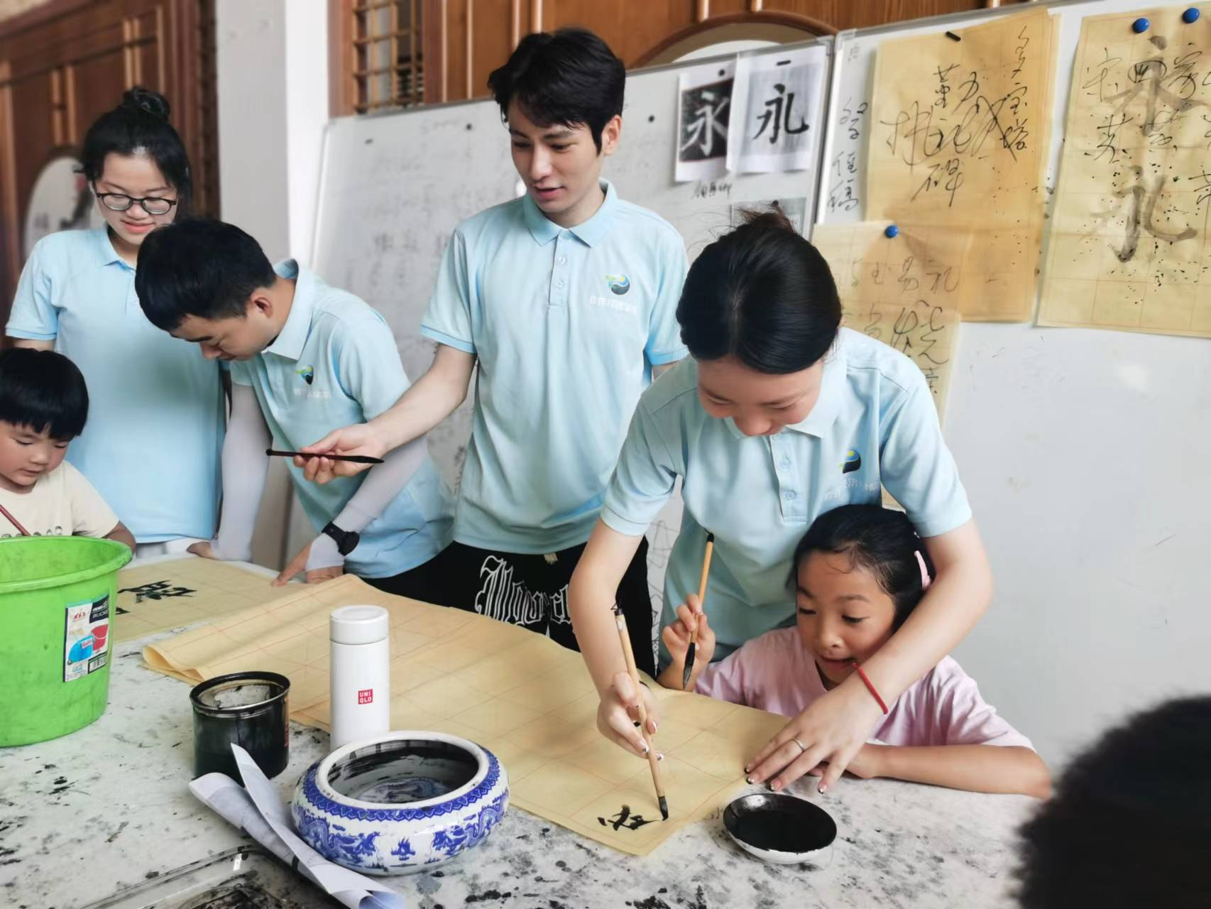 南山村每年暑假都会组织辖区学生参加书法培训。这次,实践团也参与到培训中,为孩子们讲述了王羲之、欧阳询等古代书法家的传奇故事,让孩子们感受到传统文化魅力,给他们带去更多陪伴与温暖。