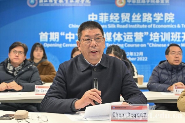 陈德泉在致辞中指出,本次培训是学校首次面向菲律宾开展的职业技能培训,标志着学校优质教学资源输出的受众地区进一步扩大,专业教学标准的内涵建设再上新台阶。他希望,双方要进一步完善中菲经贸丝路学院运行机制,持续深化国际产教融合校企合作,协同打造高质量跨境电商产业链人才培养和技术支持平台,积极开展技能培训、合作办学等多领域创新务实的合作,为两国经济发展提供更大支撑。
